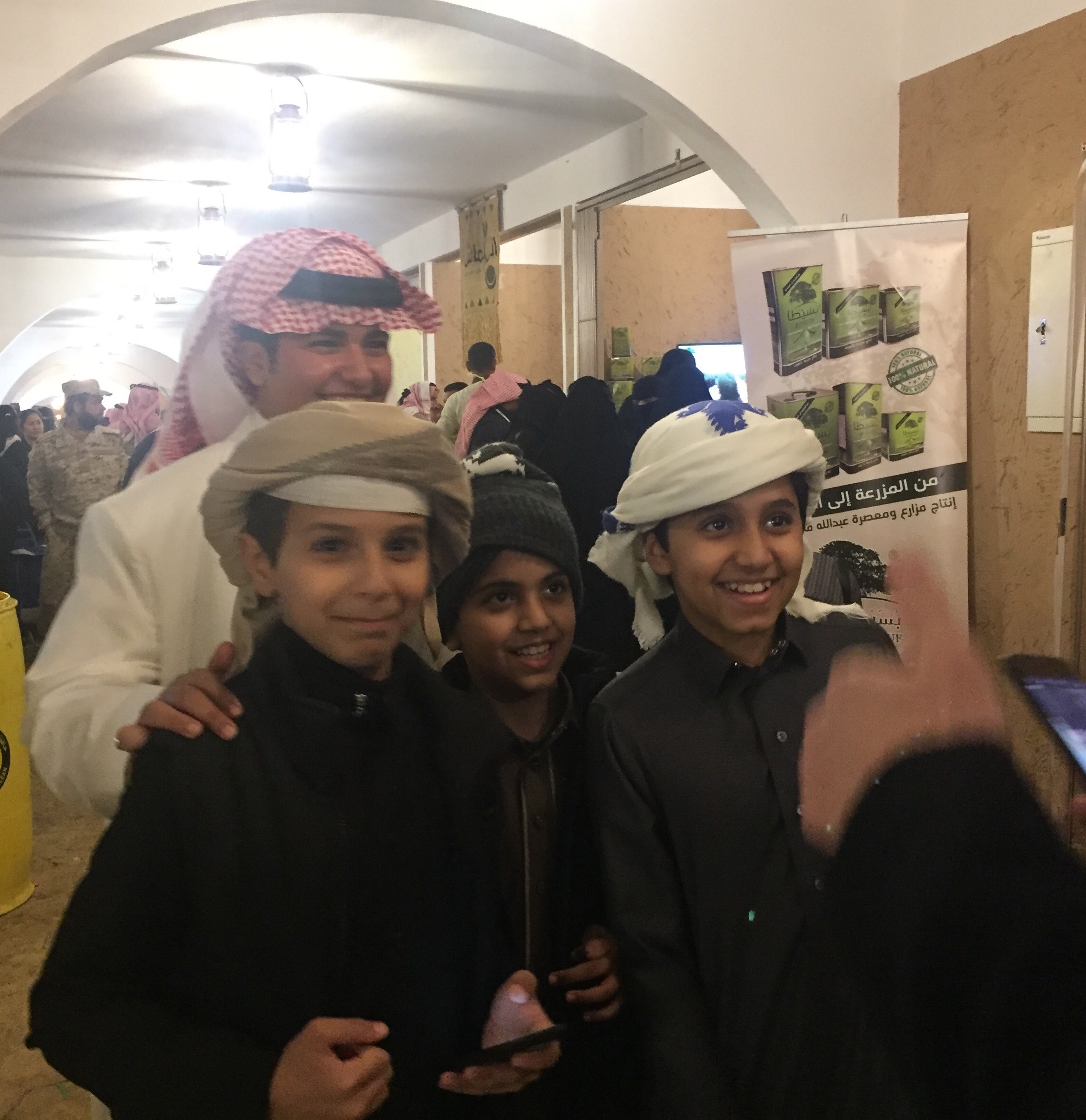Of course we saw some traditional dancing and singing with much waving of swords and sampled some local vegetable curry and rice. We also met a lovely group of guys at an olive oil stall. The olive oil is produced in the north of KSA in the Al-Jouf region close to the Jordanian border where they have over 16 million olive trees. They have received a certificate of merit from the Guinness World Records as the largest modern olive farm in the world. KSA consumes more than 30,000 tonnes of olive oil each year. The sellers from the Al Jouf Agriculture Development Company were keen to take our photos purchasing their products and were v happy for us to take their photos:
