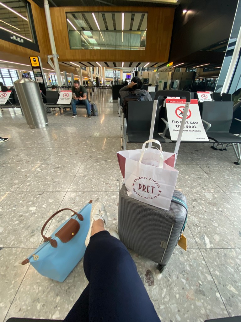 Boarding was by row. The flight was seven hours to Heathrow and we wore our masks throughout the journey. On arrival on the plane we were each given a comfort pack which included a disposable mask, a pack of tissues and a small bottle of hand sanitizer. There wasn’t the usual on-board meal service, instead we were given a paper bag snack pack with a sandwich, a bottle of OJ and a bottle of water. More water and extra sandwiches were also on offer. (The sandwiches were not the best!! Top tip, bring your own snacks!!)